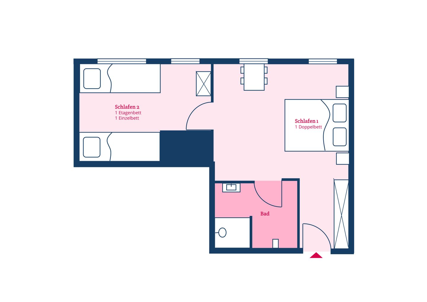 Das Familienzimmer 11 ist in ein Wohn-Schlafzimmer mit einem Doppelbett, ein Schlafzimmer mit einem Einzelbett und einem Stockbett, sowie ein Duschbad unterteilt und bietet somit komfortabel Platz für bis zu 5 Personen zuzüglich einer Kleinkinderaufbettung.