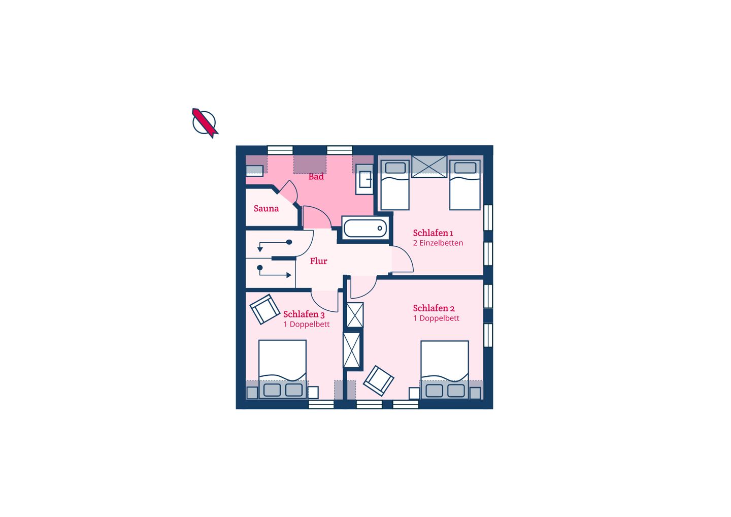 Im Obergeschoss befinden sich die drei Schlafzimmer sowie ein zusätzliches Bad mit bodengleicher Dusche und Sauna.