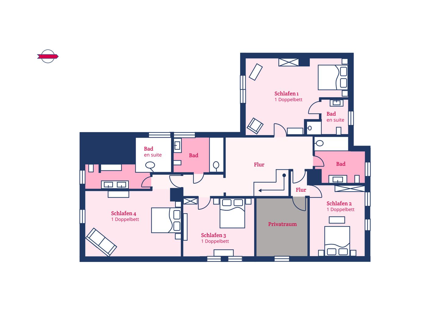 Im Obergeschoss sind die vier Schlafzimmer und die vier Duschbäder gelegen. Alle Schlafzimmer sind mit jeweils einem Doppelbett ausgestattet. Zwei der Bäder liegen en Suite.