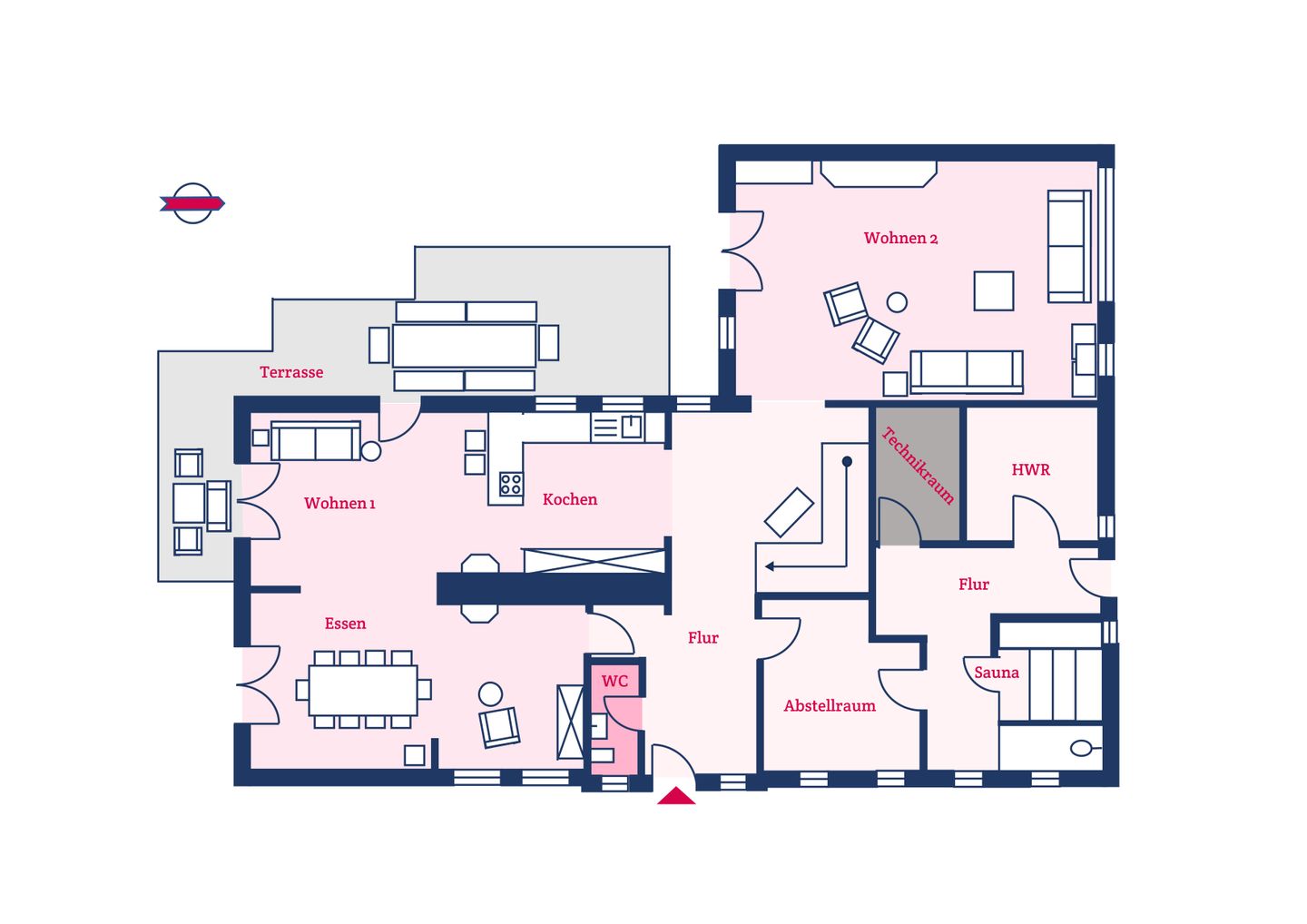 Im Erdgeschoss befinden sich das großzügige Wohn- und Esszimmer mit offener Küche, ein zweites, separates Wohnzimmer, ein Kaminzimmer, der Wellnessraum mit Sauna und Regendusche, ein Gäste-WC sowie ein Hauswirtschaftsraum mit Waschmaschine und Trockner. Über die beiden Wohnzimmer und den Essbereich gelangen Sie jeweils auf die zwei eigenen Terrassen im gemeinschaftlich genutzten Garten.