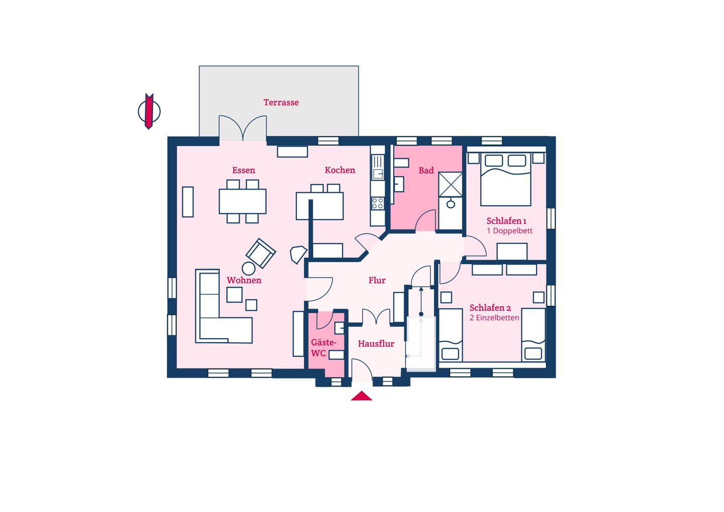 Die Ferienwohnung ist vollständig im Erdgeschoss gelegen und unterteilt sich in einen großzügigen Wohn- und Essbereich mit offener Küche, zwei Schlafzimmer - eines mit einem Doppelbett und eines mit zwei Einzelbetten -, ein Duschbad und ein Gäste-WC. Über den Essbereich gelangen Sie direkt auf die eigene Terrasse und in den gemeinschaftlichen Garten. Der Kaminofen im Wohnbereich sorgt auch an kühleren Tagen für eine angenehme Atmosphäre.