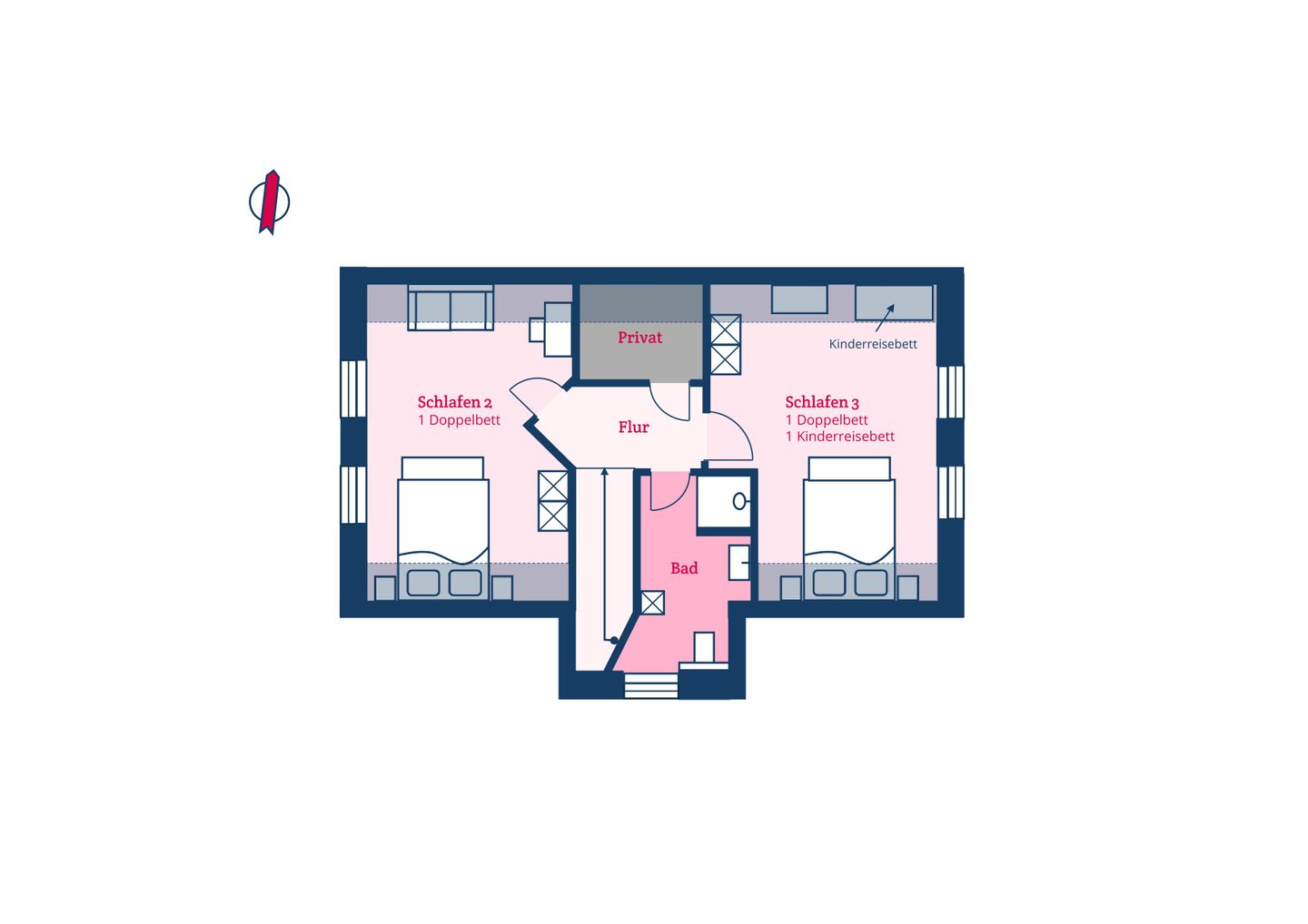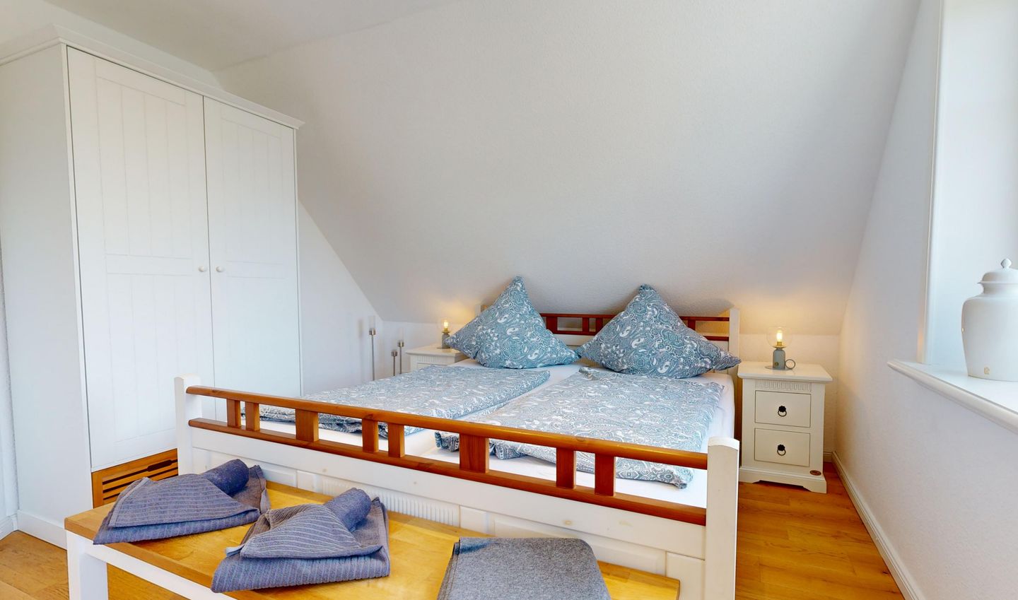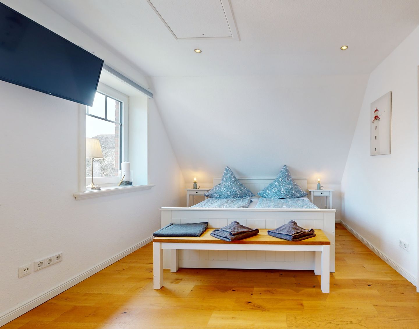 Im Obergeschoss sind zwei weitere Schlafzimmer - jeweils mit einem Doppelbett ausgestattet - sowie das zweite Duschbad gelegen. Alle Schlafzimmer sind mit einem TV ausgestattet, ein Doppelbett-Zimmer verfügt über einen Schminktisch. In beiden Bädern befinden sich Radios, die in eine Wand eingelassen sind und über den Lichtschalter bedient werden.