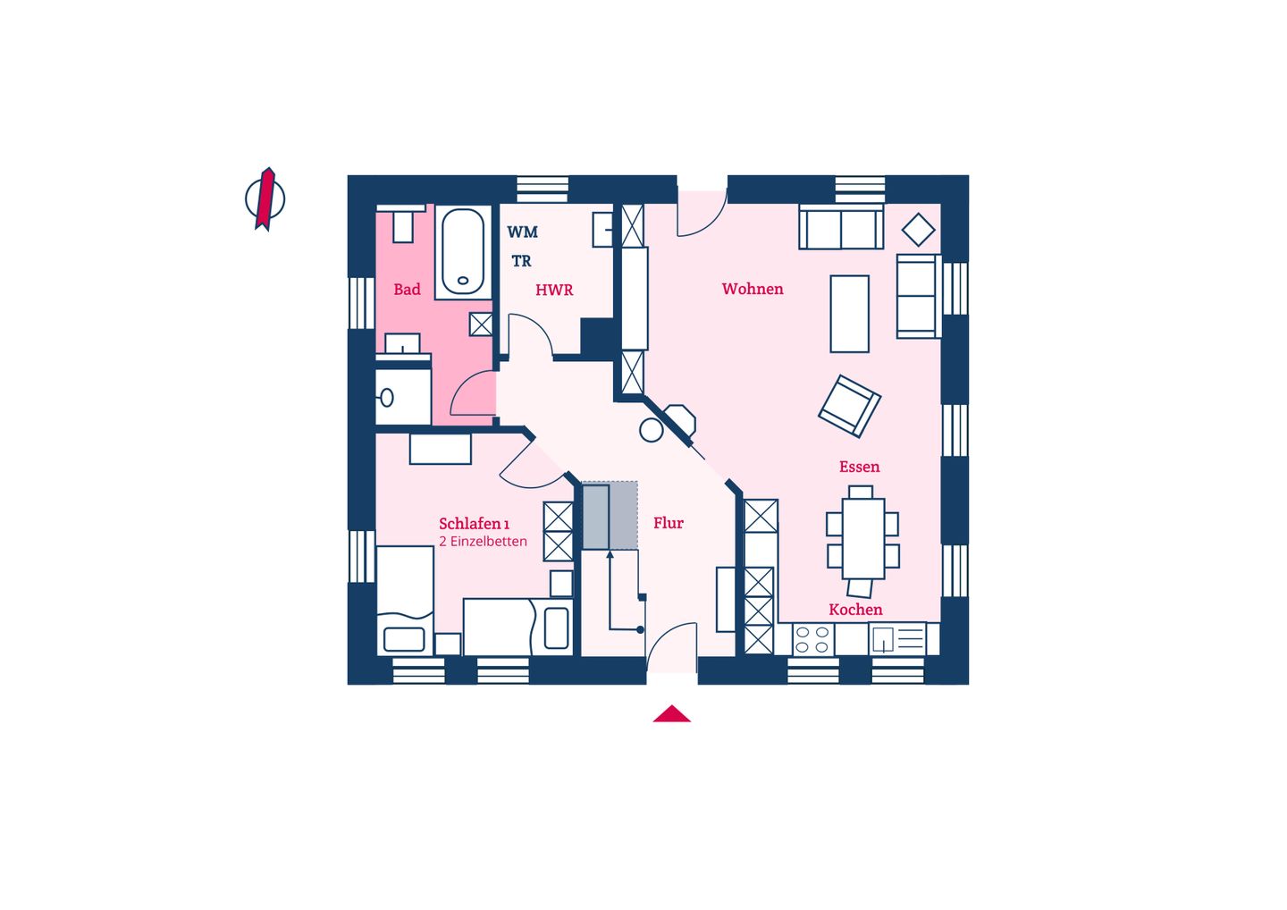 Im Erdgeschoss befinden sich ein Wohn- und Essbereich mit offener Küche, ein Schlafzimmer mit zwei Einzelbetten und ein Vollbad mit Badewanne und Raindance-Dusche, sowie ein Hauswirtschaftsraum mit Waschmaschine und Trockner. Über den Wohnbereich gelangen Sie auf die eigene Terrasse. Der Ethanol-Kamin sorgt auch an kühleren Tagen für eine angenehme Atmosphäre.