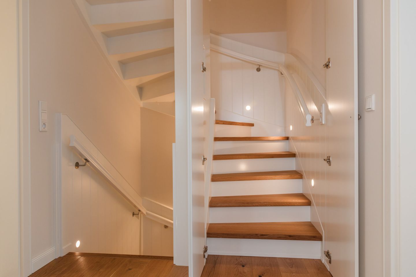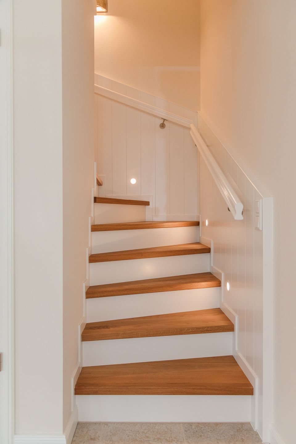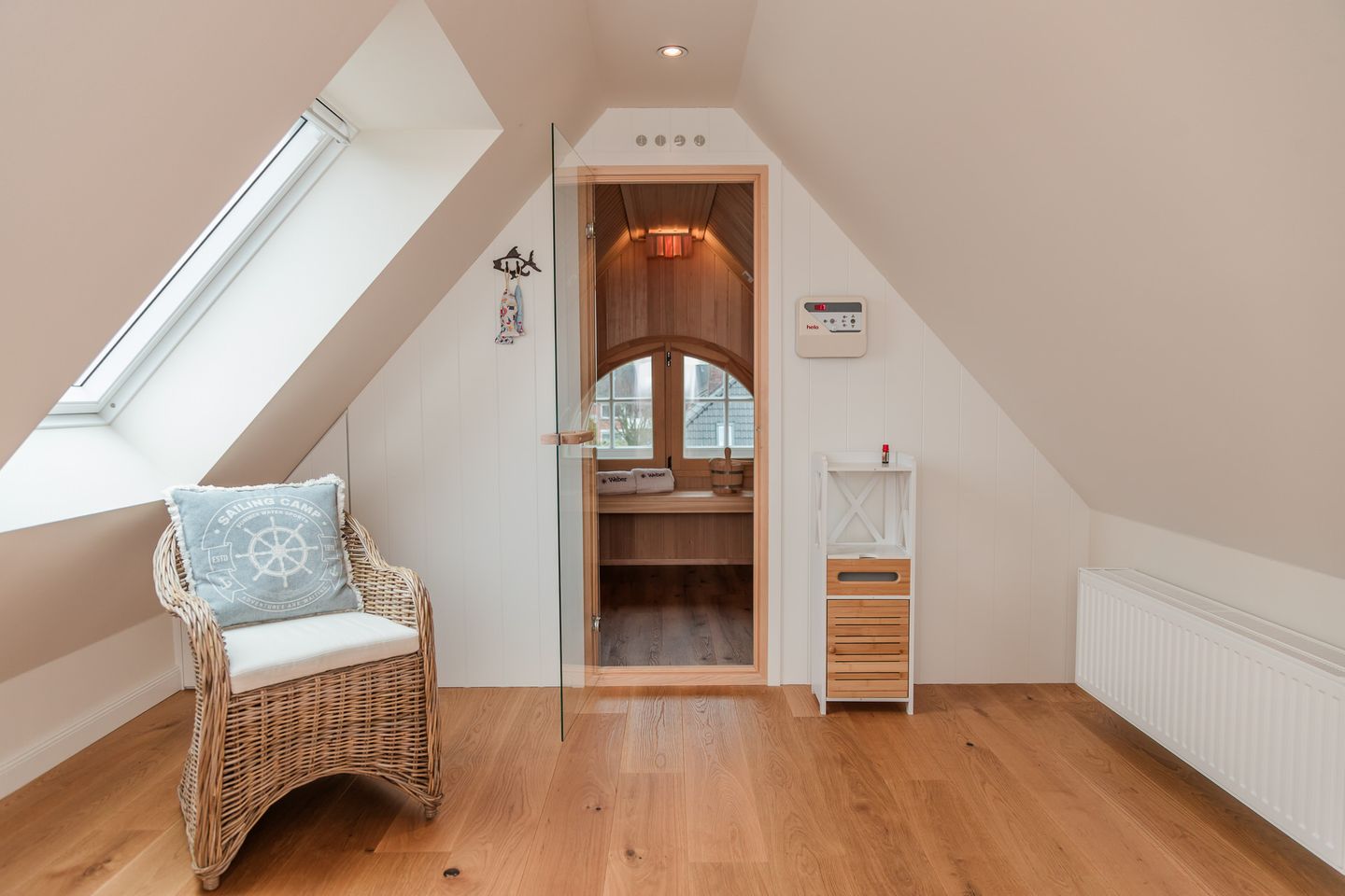 Im Obergeschoss sind die drei Schlafzimmer - zwei mit jeweils einem Doppelbett und eines mit zwei Einzelbetten - und ein Vollbad gelegen. Das Vollbad verfügt über eine Waschmaschine und einen Trockner. Im Dachgeschoss befindet sich die hauseigene Sauna samt Ruheraum.