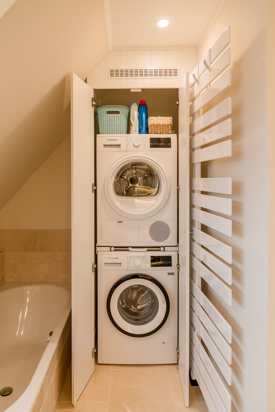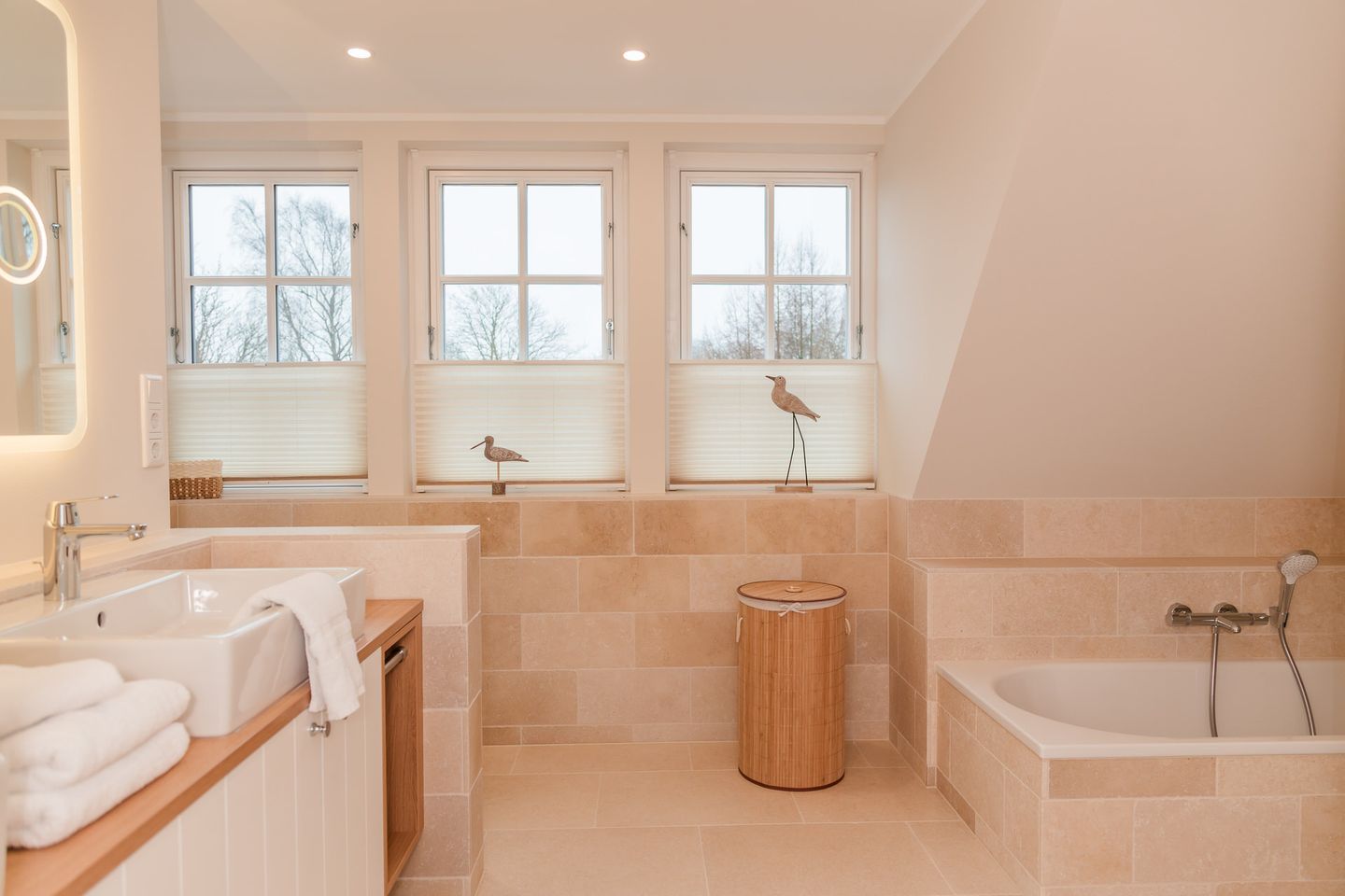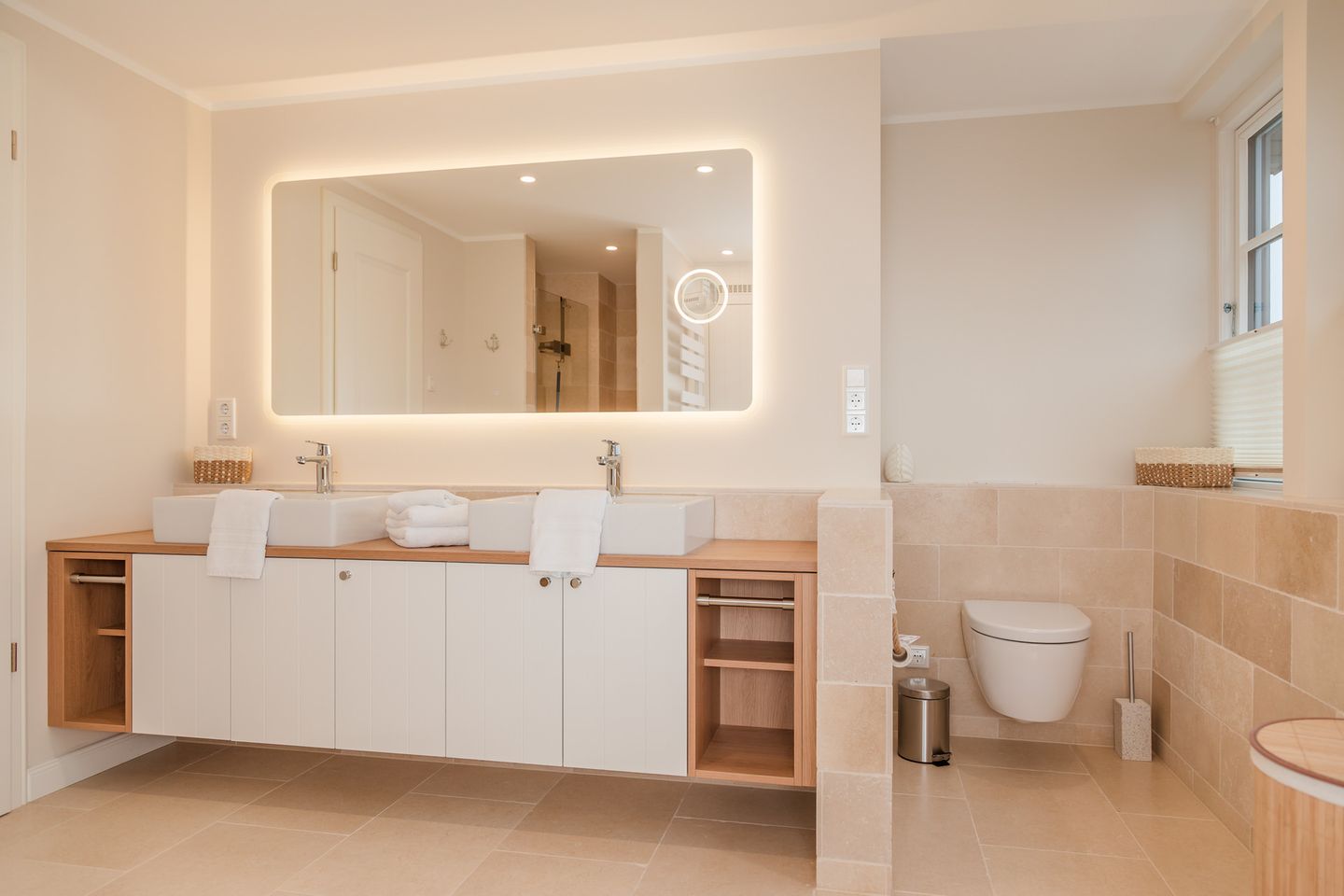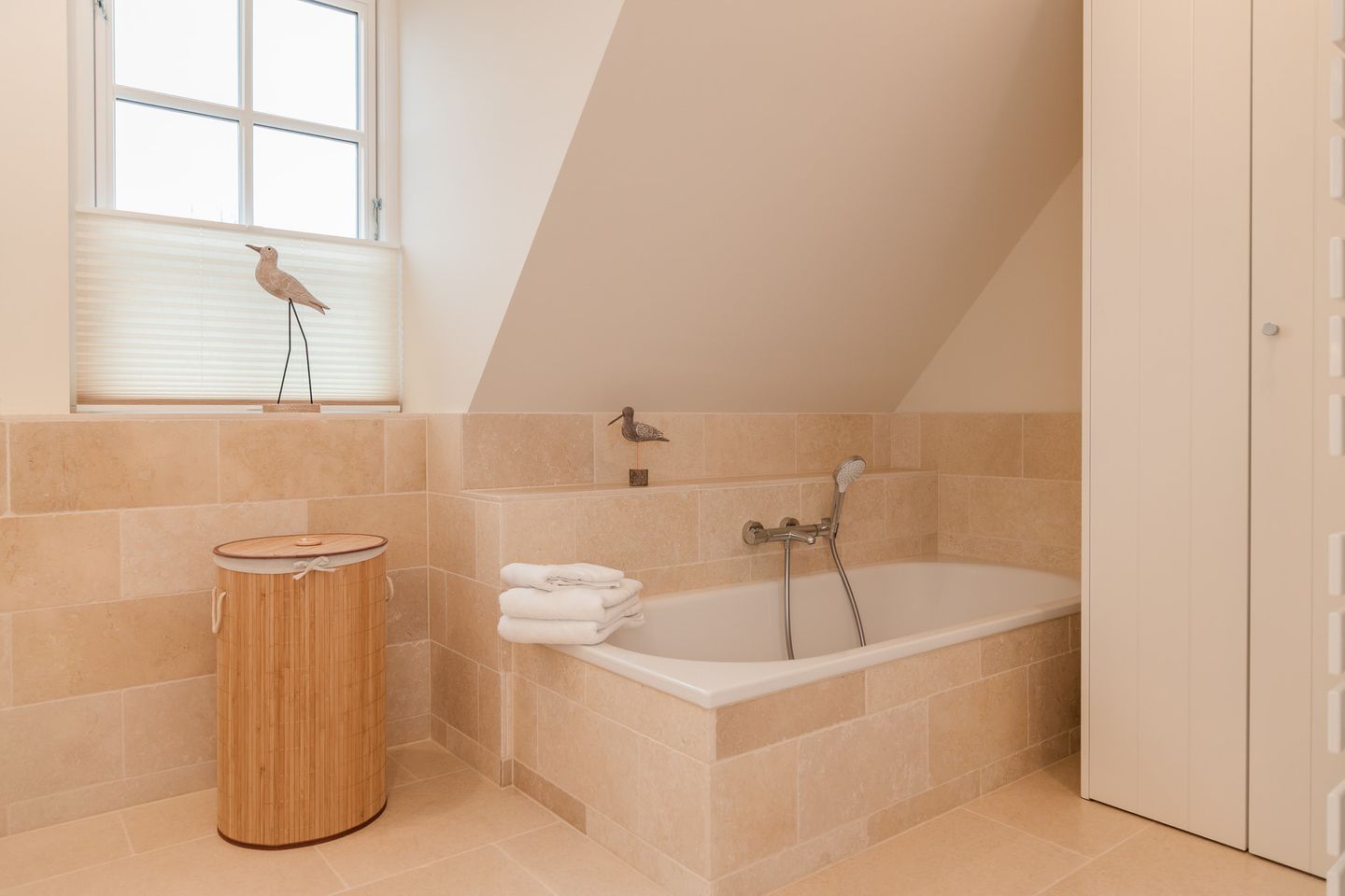 Im Obergeschoss sind die drei Schlafzimmer - zwei mit jeweils einem Doppelbett und eines mit zwei Einzelbetten - und ein Vollbad gelegen. Das Vollbad verfügt über eine Waschmaschine und einen Trockner. Im Dachgeschoss befindet sich die hauseigene Sauna samt Ruheraum.