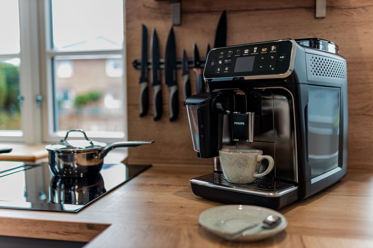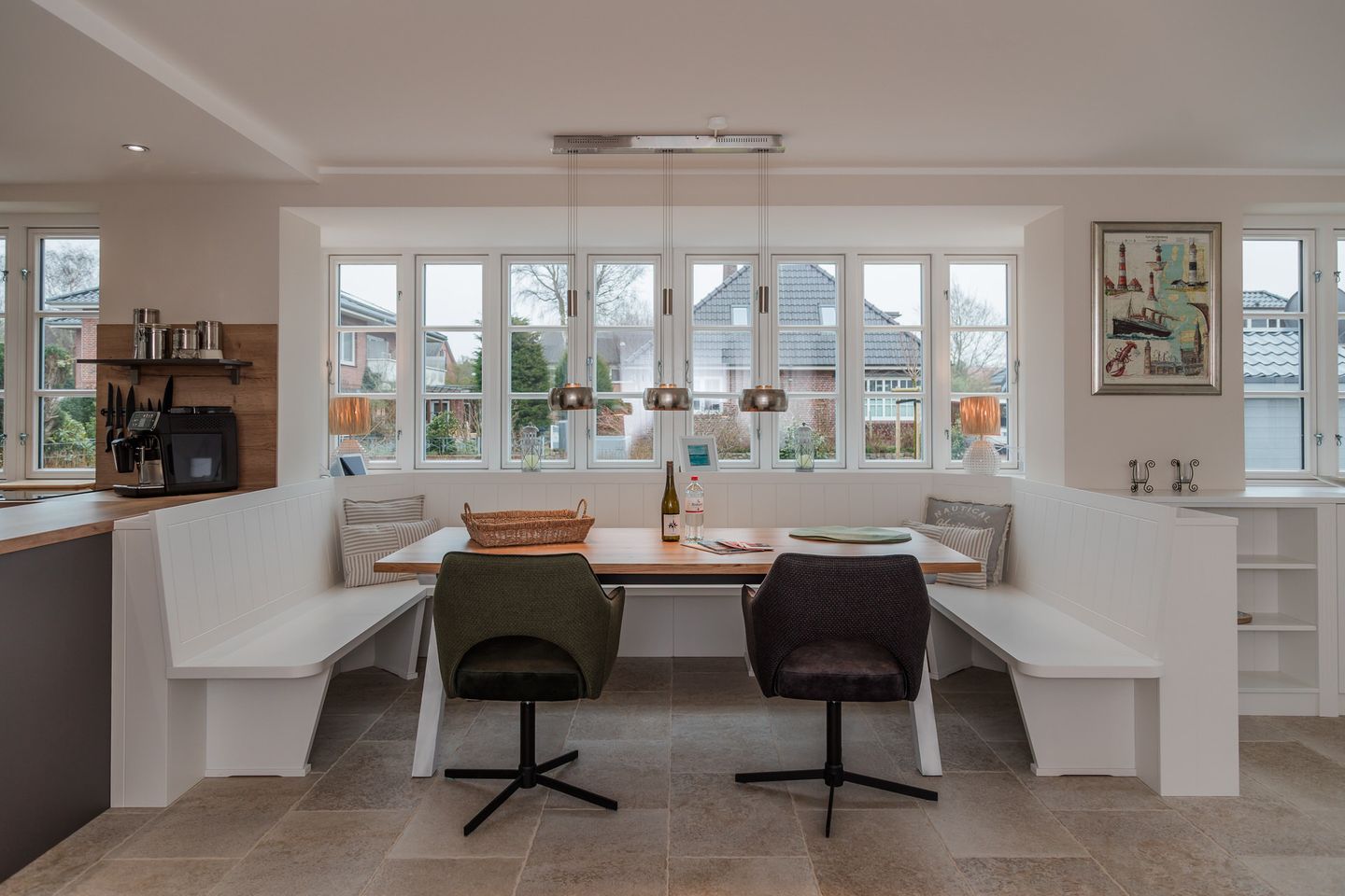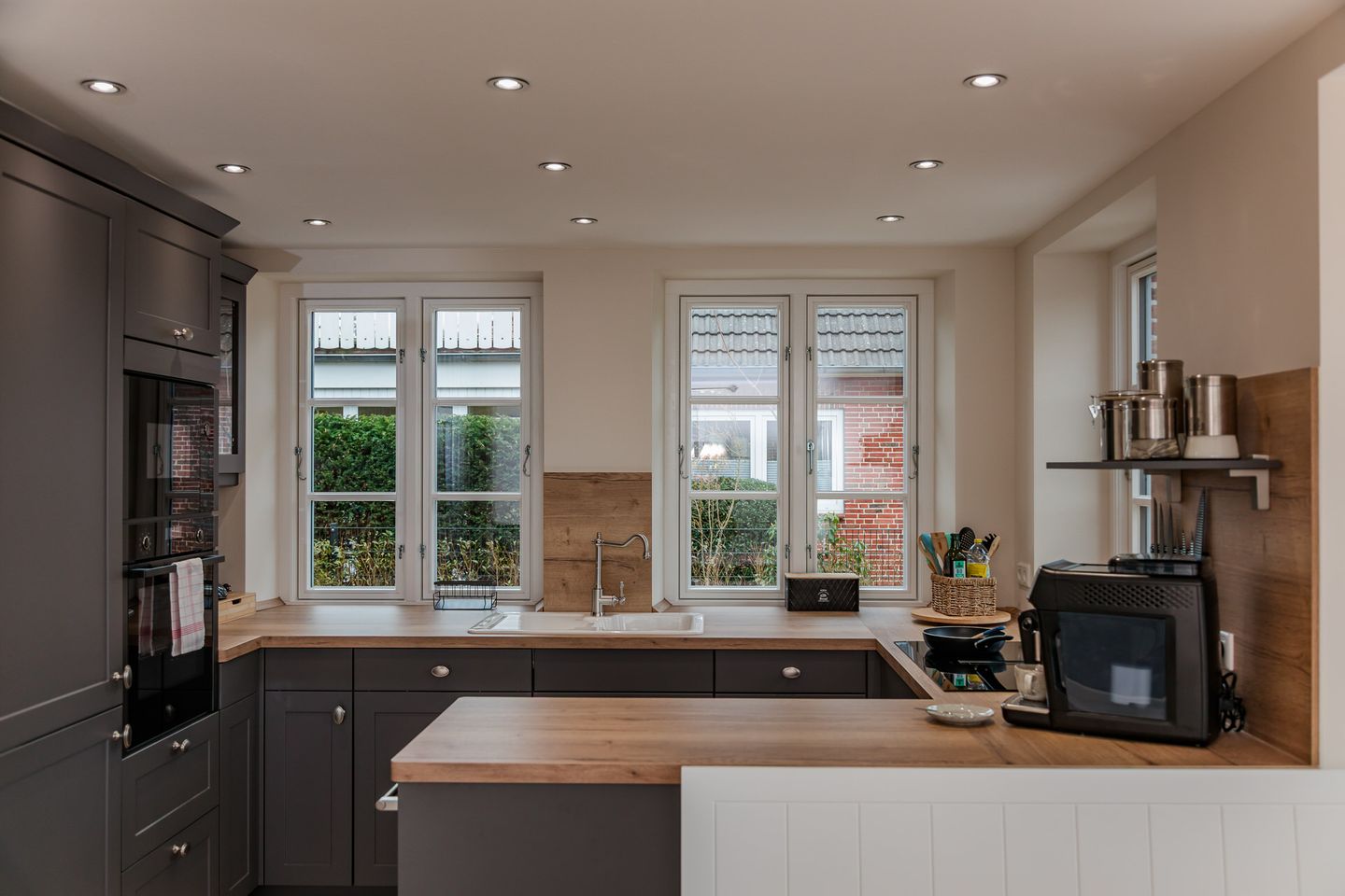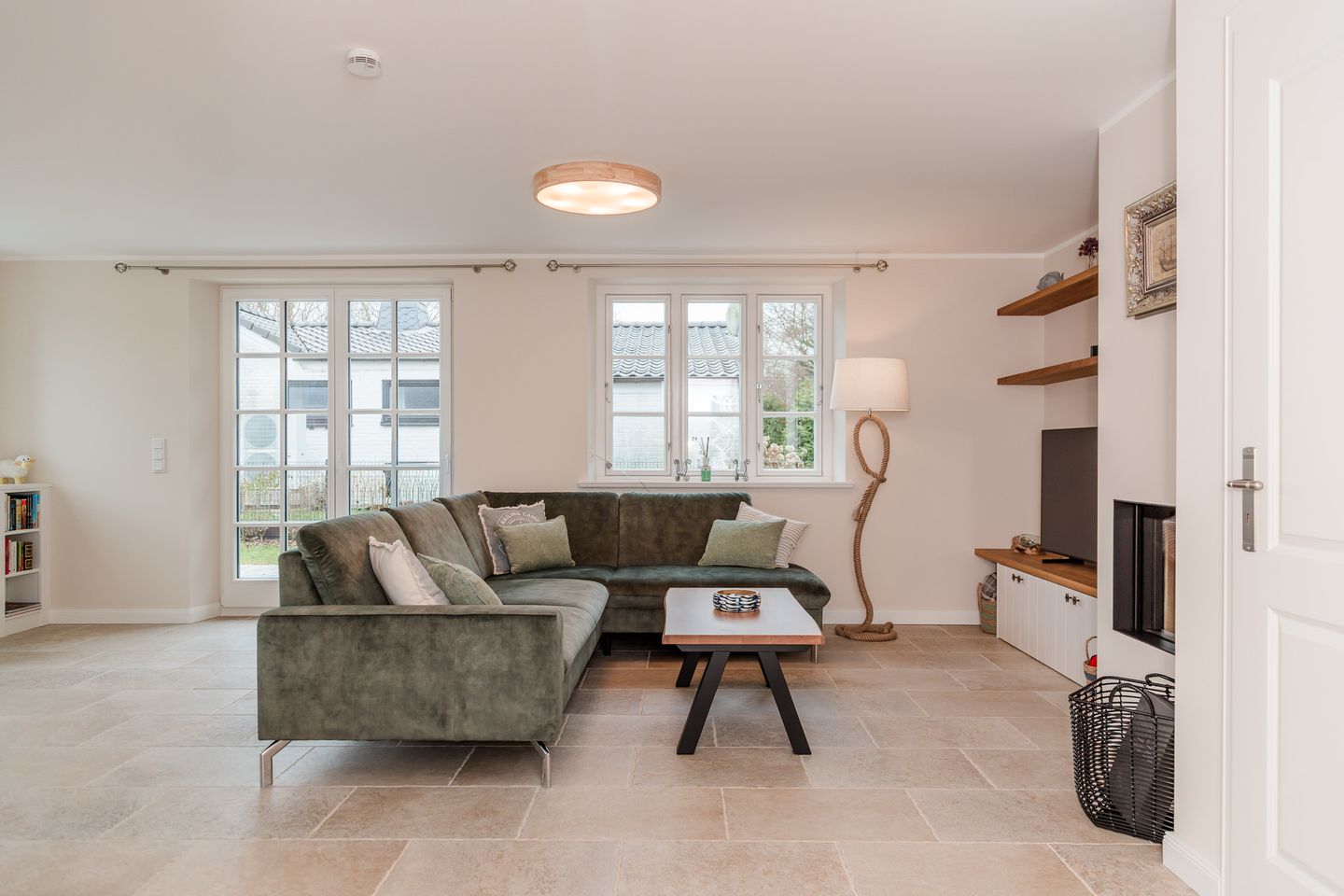 Im Erdgeschoss befinden sich der großzügige Wohn- und Essbereich mit offener Küche, sowie ein Duschbad. Über den Wohnbereich gelangen Sie direkt auf die Terrasse im eigenen Garten. Der Kamin sorgt auch an kühleren Abenden für eine angenehme Atmosphäre. Die hochwertig ausgestattete Küche lässt das Herz eines jeden Hobbykochs höher schlagen.
